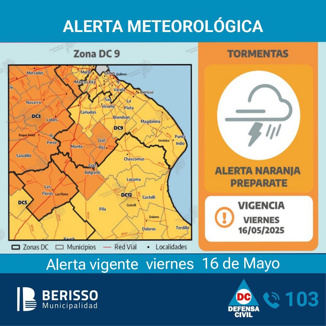 El Servicio Meteorológico Nacional emitió una alerta amarilla para Berisso y zonas aledañas debido a la probabilidad de lluvias y tormentas durante la jornada de este viernes 16 de mayo. Se trata de un fenómeno climático que afectará con mayor intensidad a los municipios bajo alerta naranja, aunque también se prevén complicaciones para nuestra ciudad.