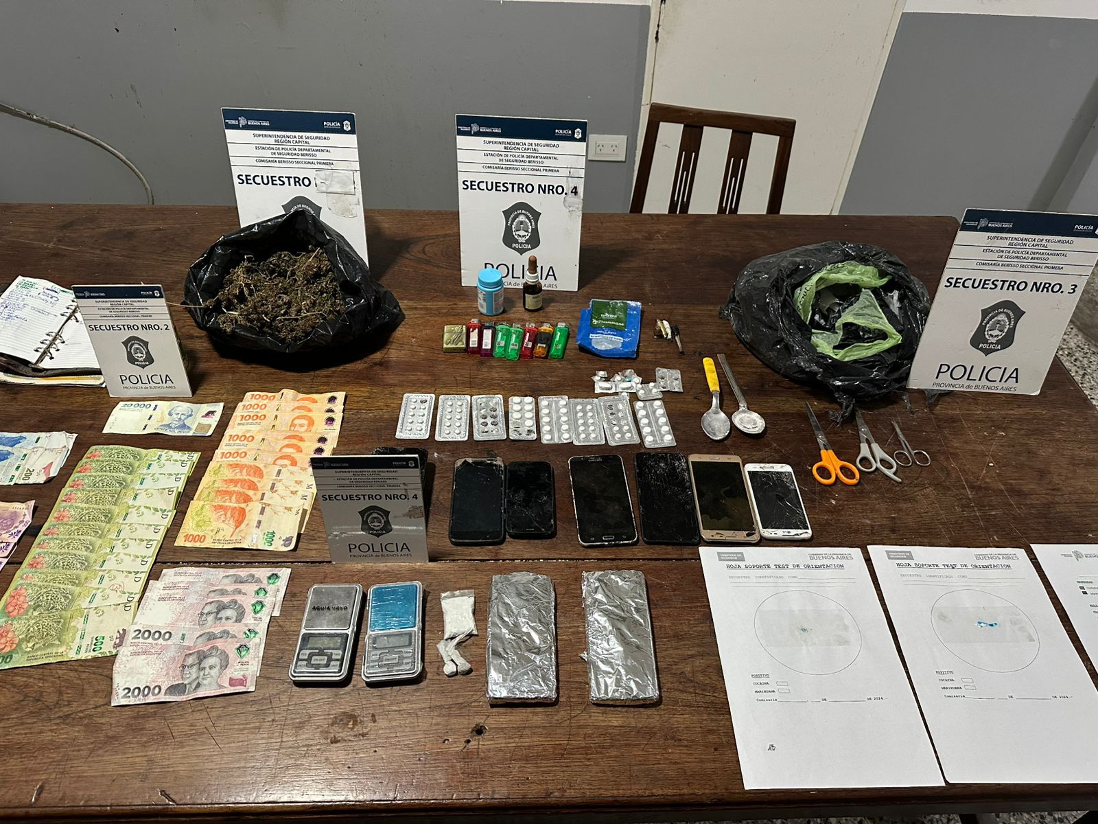 En el primer domicilio, donde reside una mujer de 30 años, los efectivos incautaron 336 gramos de marihuana, 0,3 gramos de cocaína, 0,8 gramos de paco, dos balanzas de precisión, dos teléfonos celulares y $45.200 en efectivo.