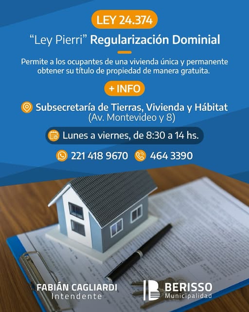 El Municipio de Berisso recuerda a los vecinos y vecinas que continúa en marcha el proceso de Regularización Dominial establecido por la Ley 24.374, conocida como “Ley Pierri”, que permite a quienes habitan una vivienda única y permanente acceder de forma gratuita al título de propiedad.