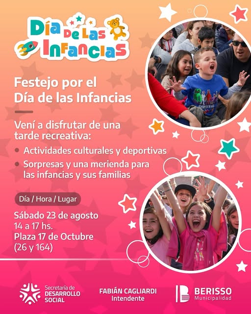 Este sábado 23 de agosto, de 14 a 17 horas, la Plaza 17 de Octubre (26 y 164) será escenario de una fiesta pensada especialmente para las infancias de Berisso, con múltiples propuestas recreativas y culturales.