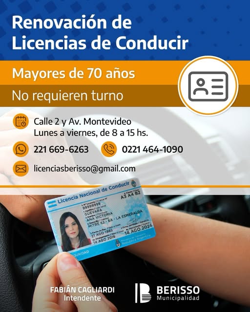 La Municipio de Berisso informó que las personas mayores de 70 años pueden renovar su licencia de conducir sin turno previo, con el objetivo de agilizar el trámite y facilitar el acceso a este servicio.