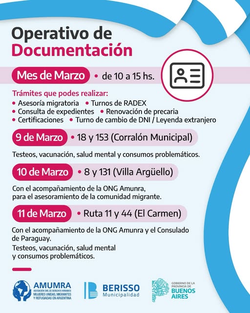 La Municipalidad de Berisso anunció la realización de un Operativo de Documentación destinado a la comunidad migrante, que se llevará a cabo durante el mes de marzo en distintos barrios de la ciudad con el objetivo de facilitar trámites y brindar asesoramiento.