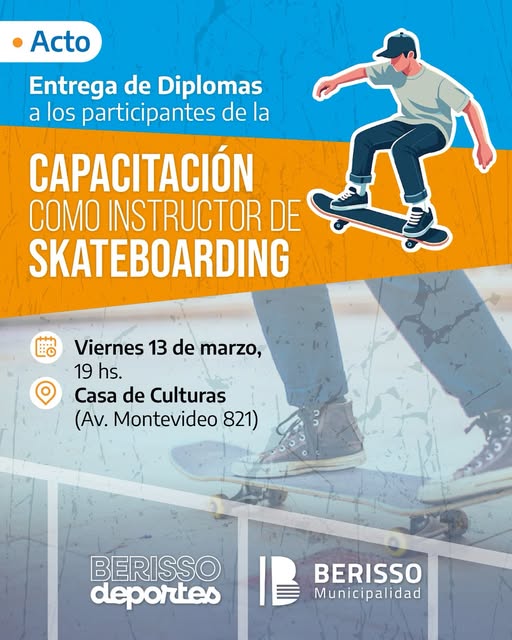 La Municipalidad de Berisso realizará una entrega de diplomas a instructores de skateboarding que finalizaron un proceso de formación orientado a fortalecer el desarrollo de esta disciplina en la ciudad.