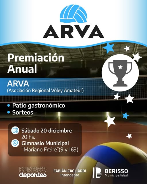Este sábado 20 de diciembre, se llevará a cabo la Premiación Anual de ARVA (Asociación Regional de Vóley Amateur), una jornada destinada a reconocer el esfuerzo, la dedicación y el compromiso de quienes integran el vóley regional a lo largo de todo el año.