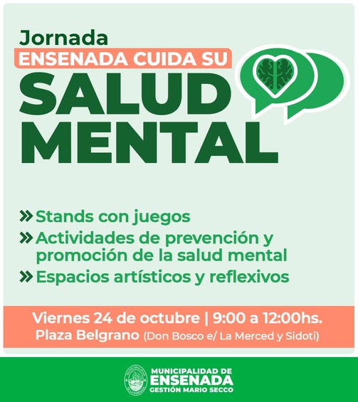 La Municipalidad de Ensenada invita a la comunidad a participar de una jornada abierta sobre salud mental, que se llevará a cabo el viernes 24 de octubre, de 9 a 12 horas, en la Plaza Belgrano.