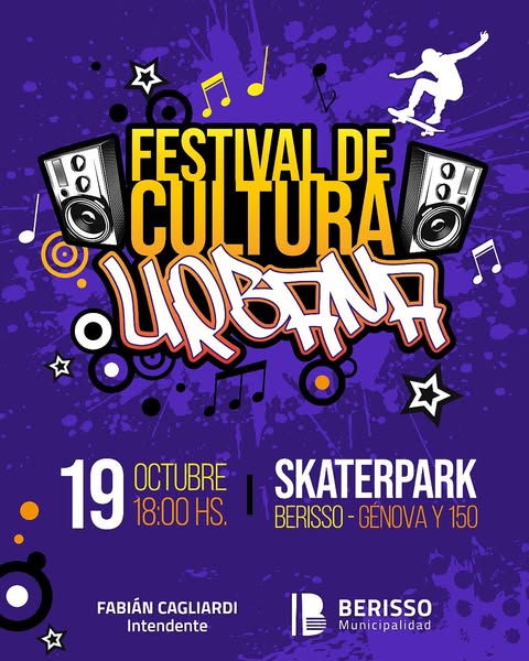 La Municipalidad de Berisso invita a disfrutar del Festival de Cultura Urbana, que se realizará el sábado 19 de octubre desde las 18 horas en el Skatepark de Berisso, ubicado en Avenida Génova y 150.