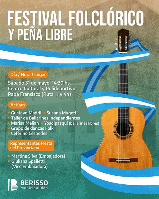 Este sábado 31 de mayo a partir de las 14:30 horas, el Centro Cultural y Polideportivo Papa Francisco (ubicado en Ruta 11 y 44) será escenario de una tarde a pura música, danza y espíritu criollo con una nueva edición del Festival Folclórico y Peña Libre.