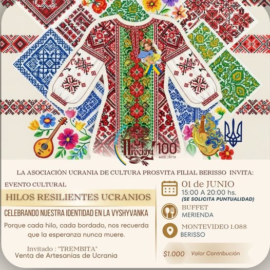 La Asociación Ucrania de Cultura Prosvita Filial Berisso invita al evento cultural «Hilos Resilientes Ucranios», una celebración dedicada a la identidad ucraniana expresada en la tradicional vyshyvanka —la emblemática camisa bordada que simboliza la historia, esperanza y resistencia del pueblo ucraniano.