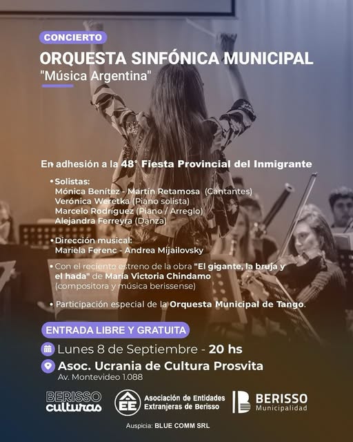 En el marco de la 48° Fiesta Provincial del Inmigrante, la Orquesta Sinfónica Municipal de Berisso ofrecerá un concierto dedicado a la Música Argentina el próximo lunes 8 de septiembre a las 20 horas en la sede de la Asociación Ucraniana de Cultura Prosvita (Av. Montevideo 1088).