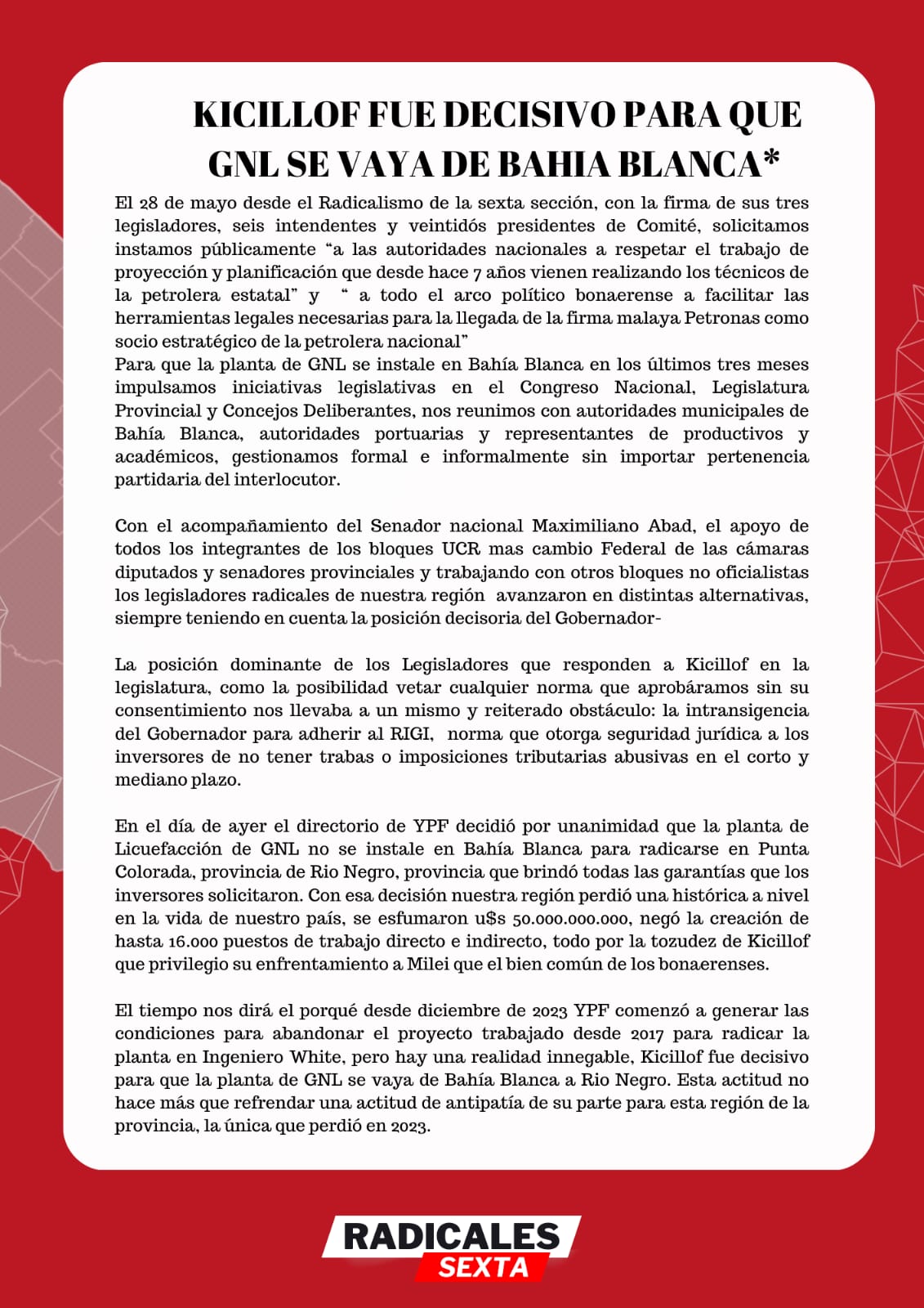 El 28 de mayo desde el Radicalismo de la sexta sección, con la firma de sus tres legisladores, seis intendentes y veintidós presidentes de Comité, solicitamos instamos públicamente “a las autoridades nacionales a respetar el trabajo de proyección y planificación que desde hace 7 años vienen realizando los técnicos de la petrolera estatal”, y “a todo el arco político bonaerense a facilitar las herramientas legales necesarias para la llegada de la firma malaya Petronas como socio estratégico de la petrolera nacional”.
