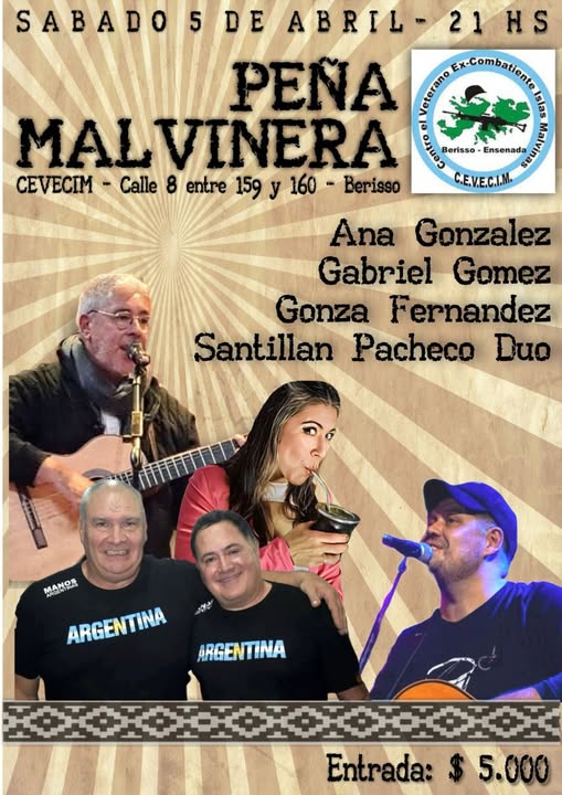 El próximo sábado 5 de abril a las 21:00 horas en el Centro de Ex Combatientes de Malvinas CEVECIM de calle 8 entre 159 y 160, se realizará una Peña Malvinera que contará con las actuaciones de artistas como Ana González, Gabriel Gómez, Gonza Fernández y Santillán Pacheco Duo.