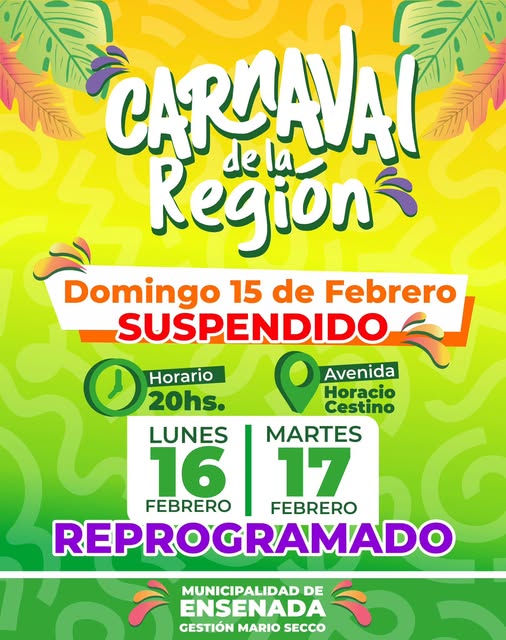 Desde Municipalidad de Ensenada informaron que, debido a las condiciones climáticas adversas, se decidió reprogramar el Carnaval de la Región previsto para este fin de semana.